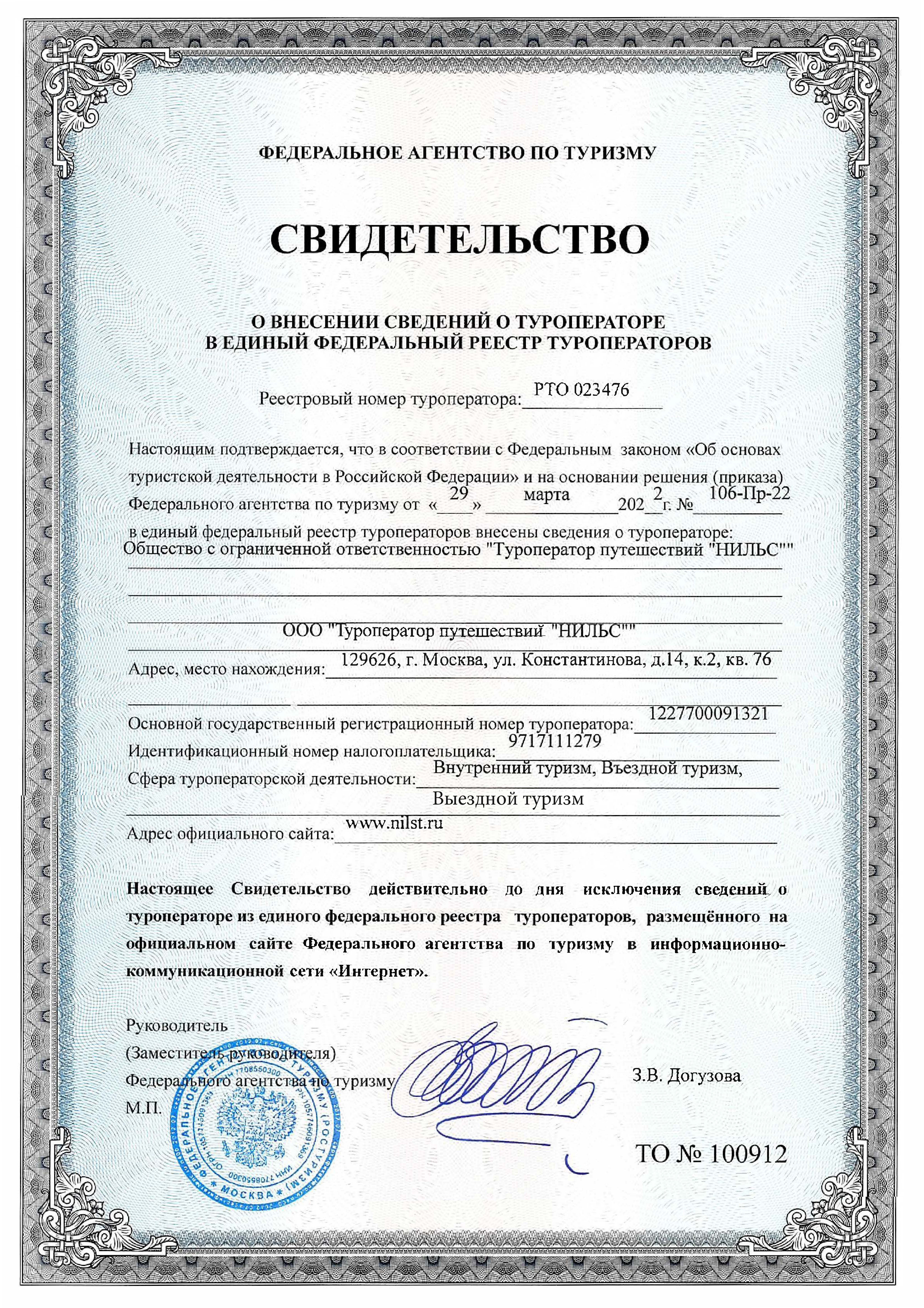 Наше свидетельство туроператора