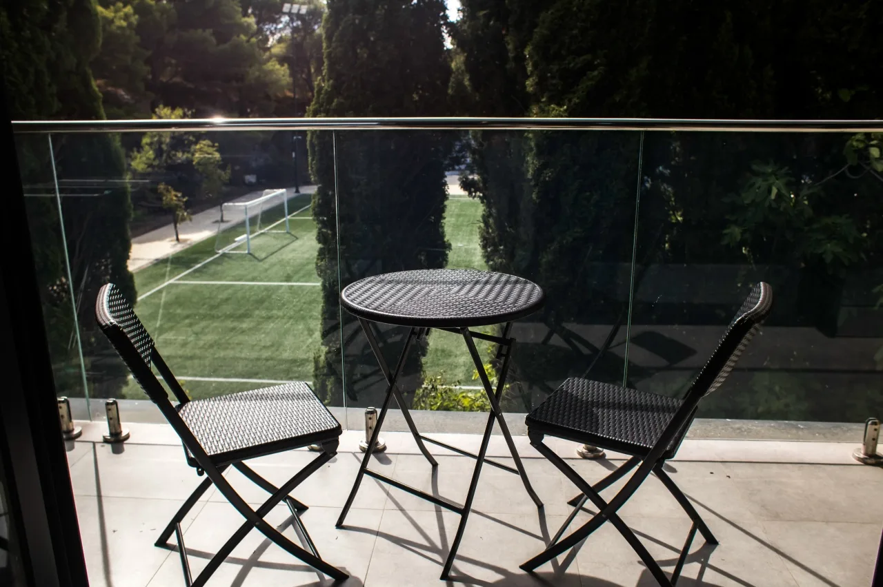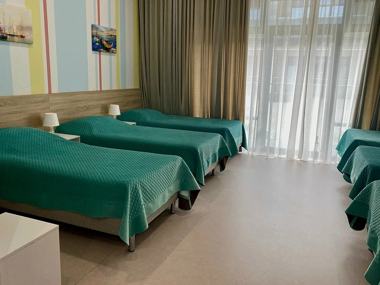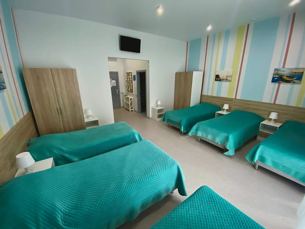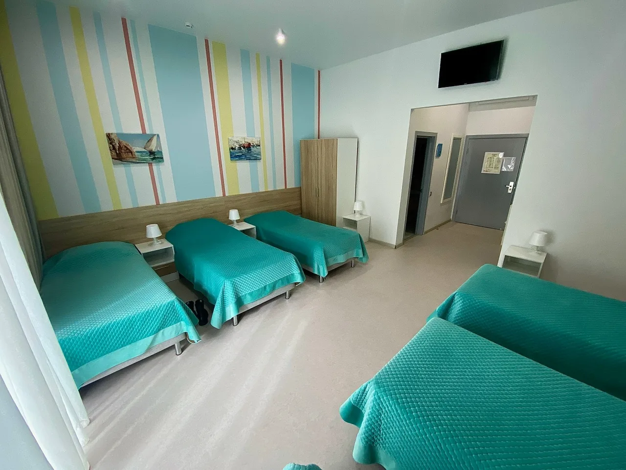 В номере: одноярусные кровати, шкафы, прикроватные тумбочки, телевизор, кондиционер, балкон.