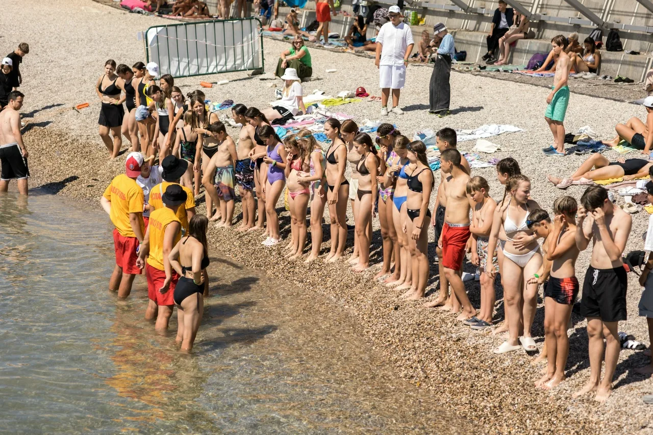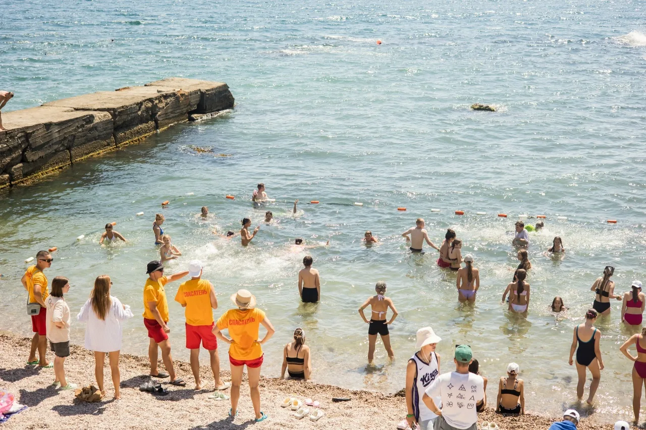 Работают спасатели, зона купания ограждена.