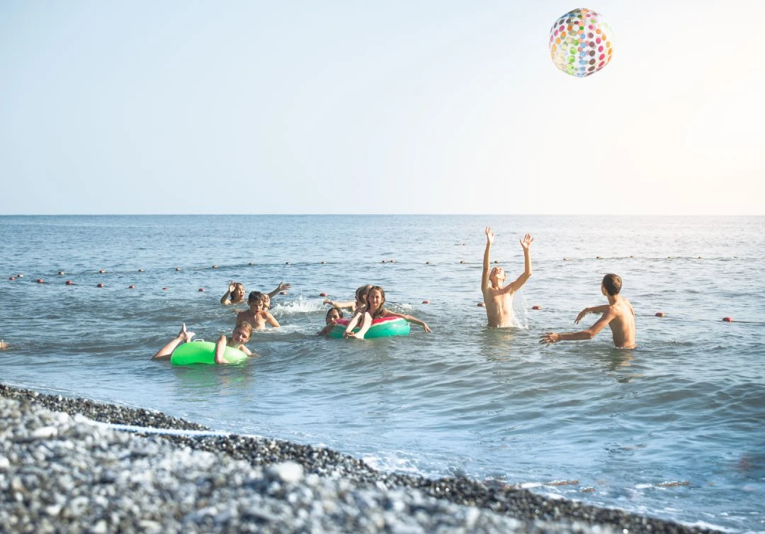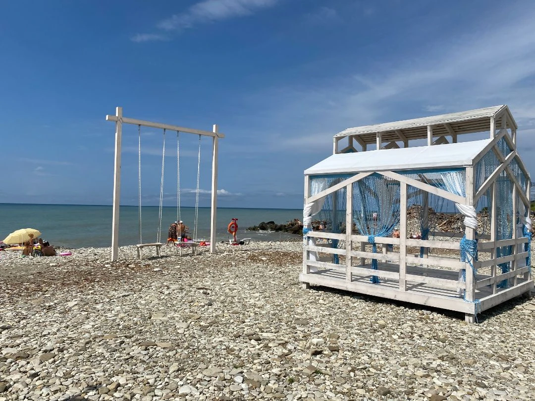 Пляж собственный галечный в 20 м от корпусов, оборудованный лежаками, зонтами, навесами. На пляже: аэрарий, медицинский пункт, спасательная служба. Зона купания ограждена.