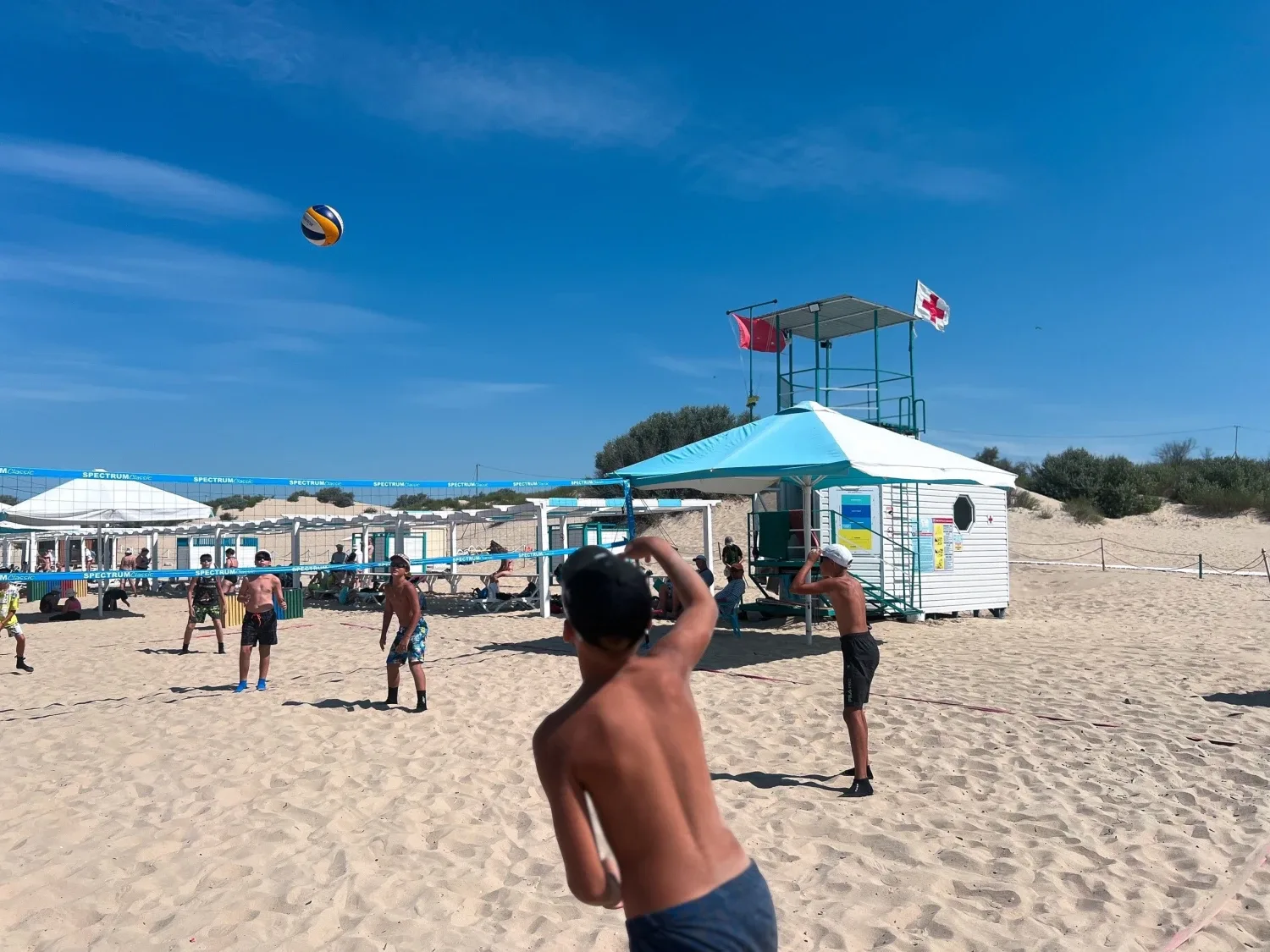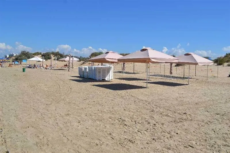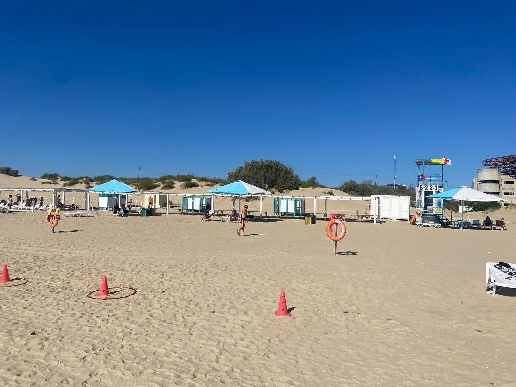 Территория пляжа оснащена теневыми навесами и зонтами, шезлонгами, полным комплектом спасательных средств. Организованно постоянное дежурство спасателей и медперсонала, зона купания ограждена.