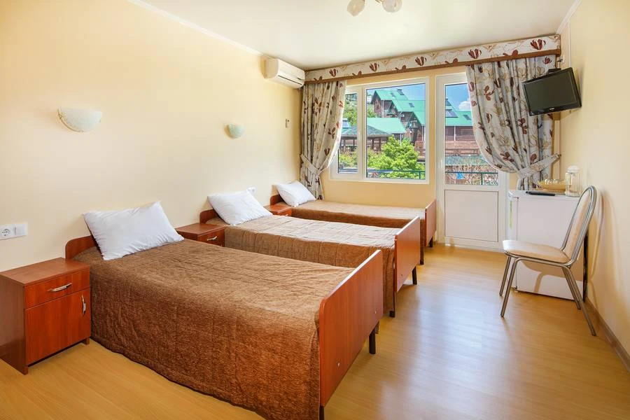 В номере: кровати, шкаф, прикроватные тумбочки, сплит-система, спутниковое ТВ, холодильник.