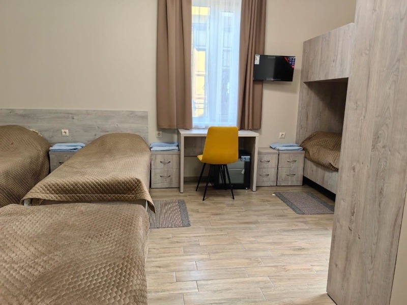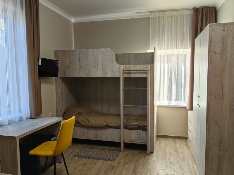 В номерах: кровати с ортопедическим матрасами, шкаф, тумбочки, телевизор, холодильник, стол, стул, в каждой комнате установлено по одной 2-ярусной кровати.