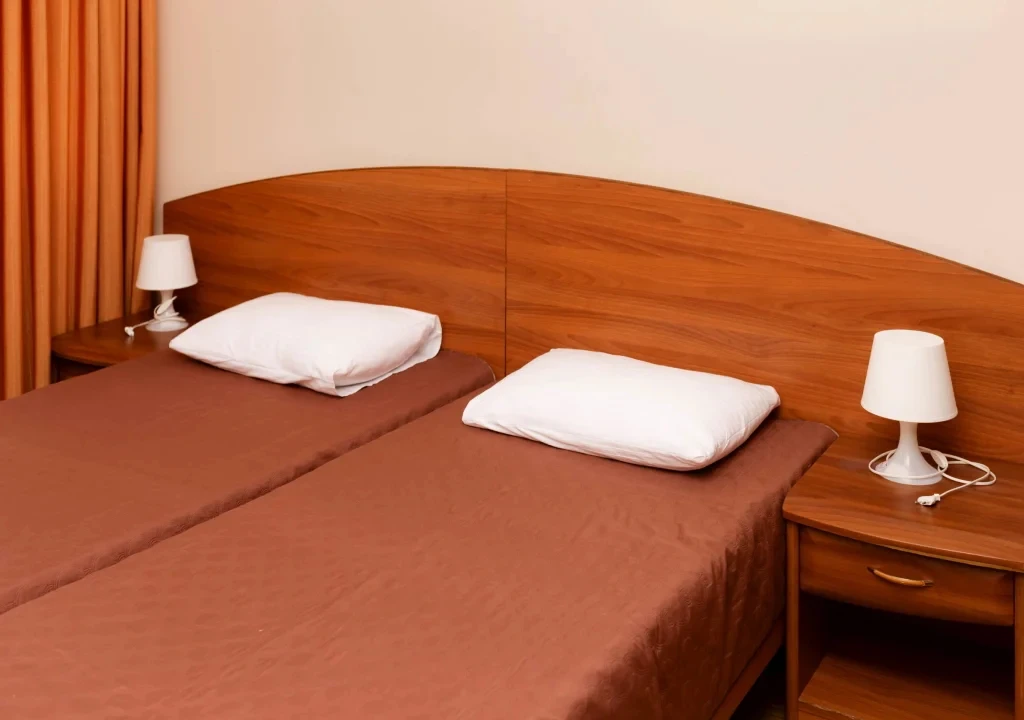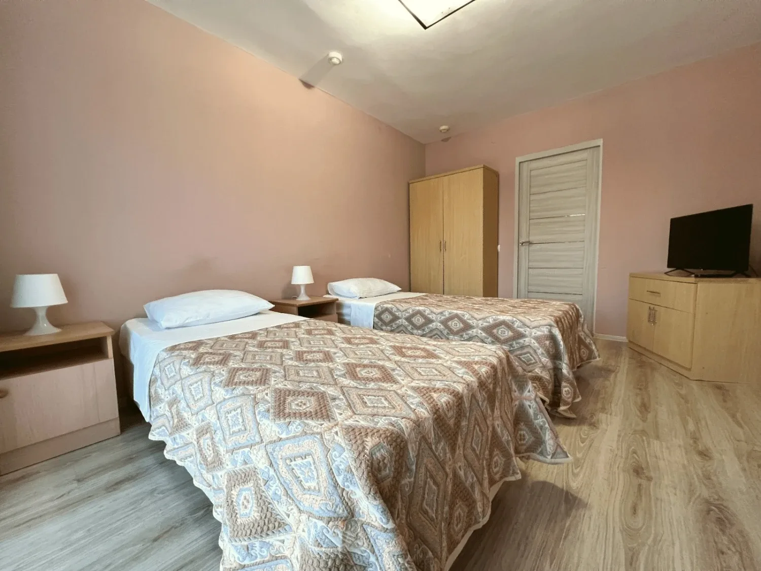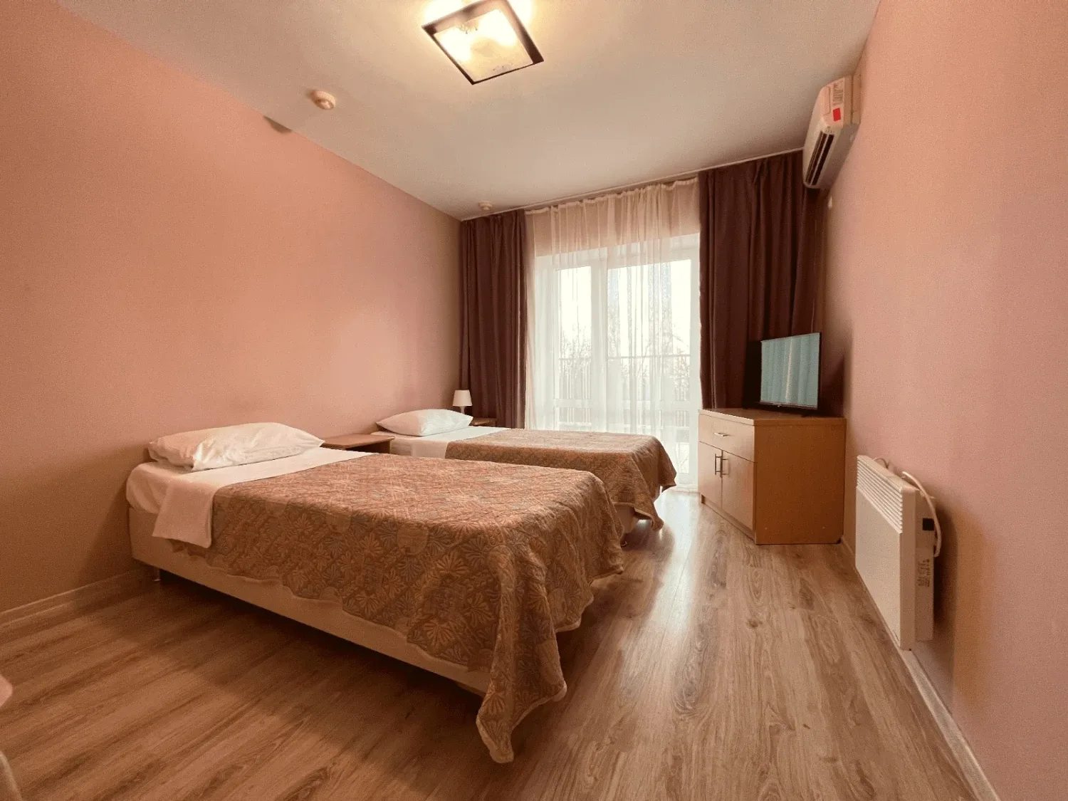 В номерах: кровати, холодильник, стол, стулья, тумбочки, кондиционер, телевизор, балкон. Холодная и горячая вода круглосуточно. Уборка ежедневно.