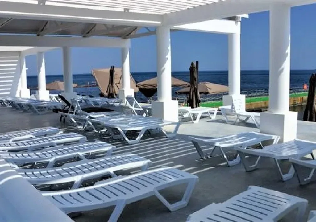 На пляже: шезлонги, навес, удобный пирс, кабинки для переодевания, душевые кабинки, туалеты, кафе.