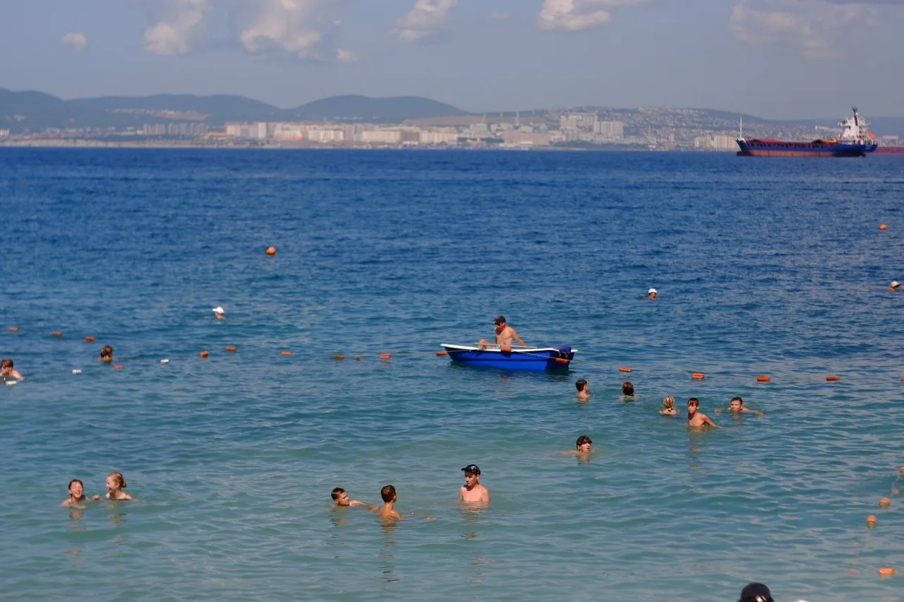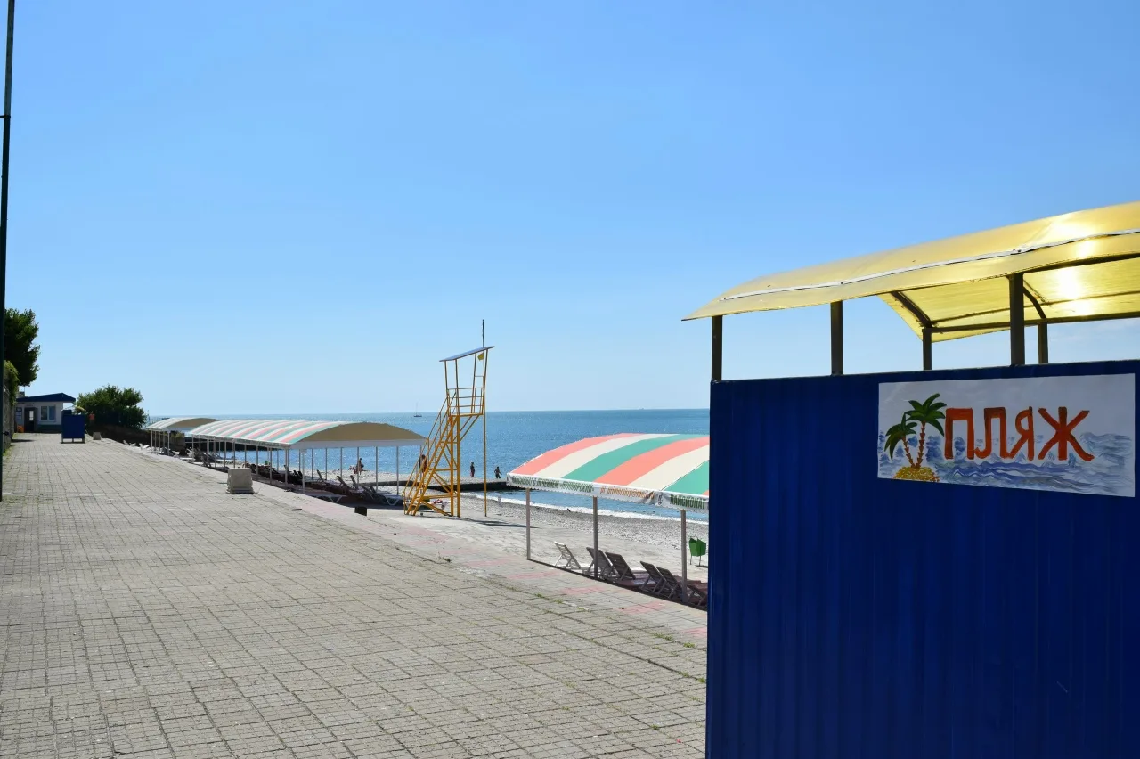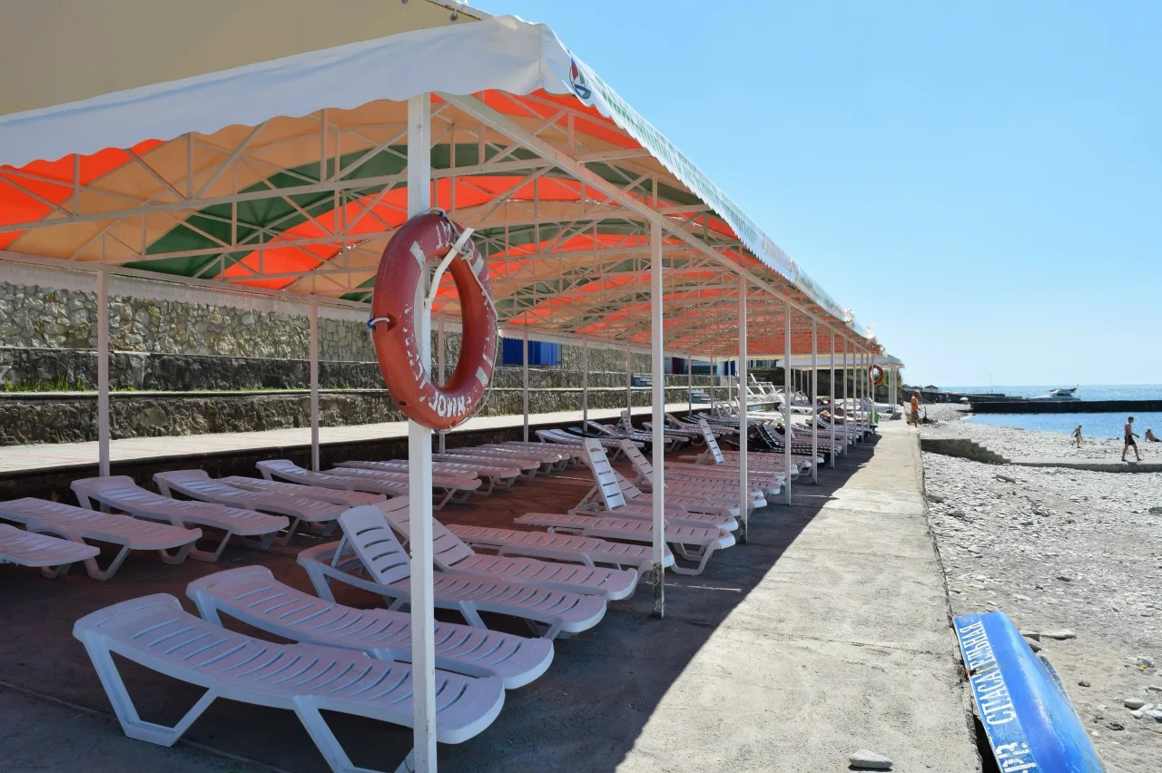 На пляже: медицинский пункт, спасательная служба, душевые, кабины для переодевания, теневые навесы, лежаки.