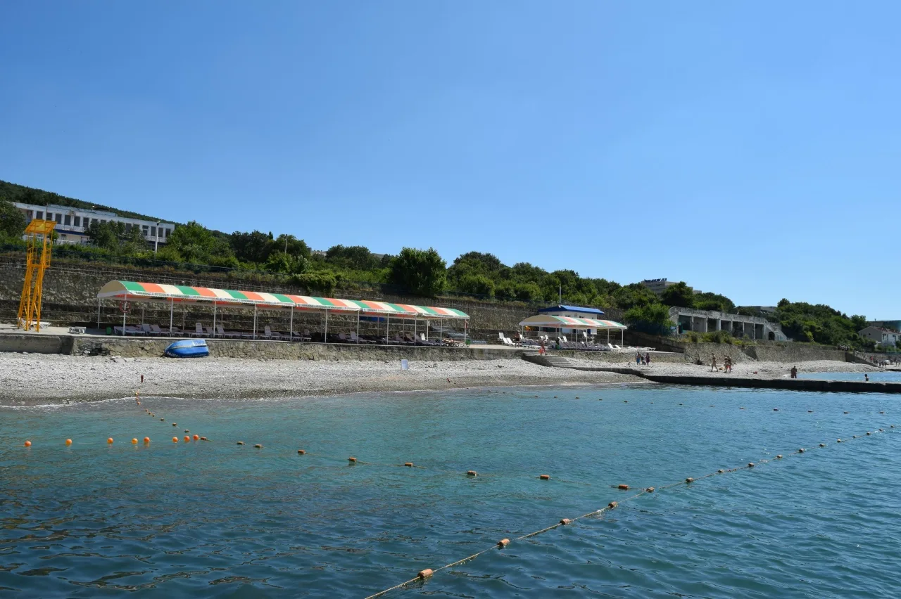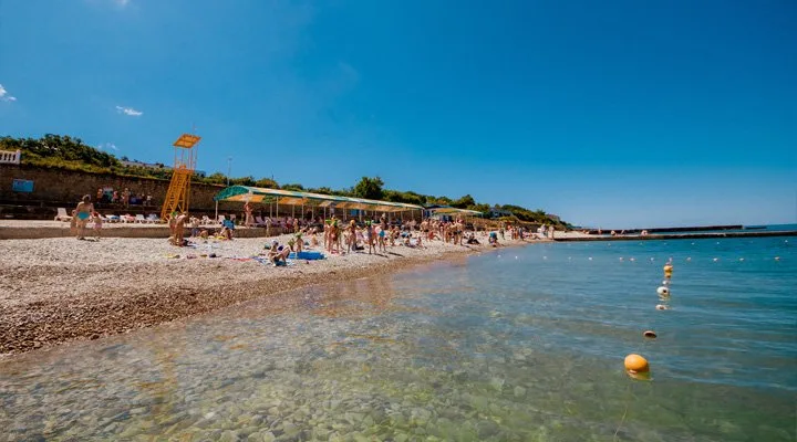 Пляж собственный галечный, расположенный всего в 50-и метрах от корпусов. Пляж (3000 м2), находится на выходе из бухты в отрытое море, в связи с чем вода здесь всегда чистая.