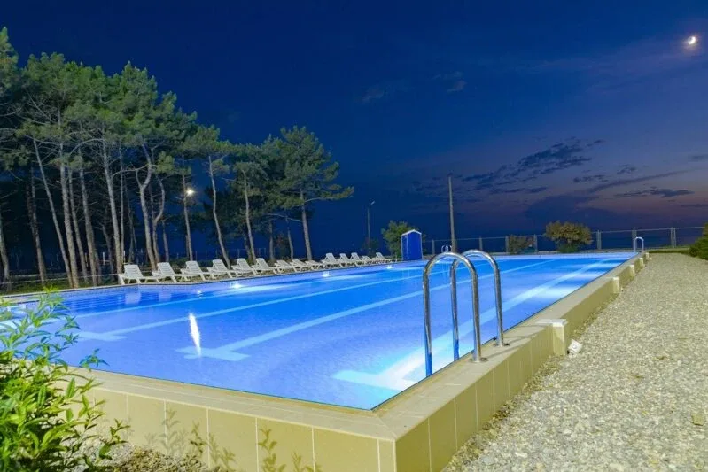 - открытый бассейн с подогревом (25*9, 4 дорожки, глубина 1,4-1,8, пресная вода);