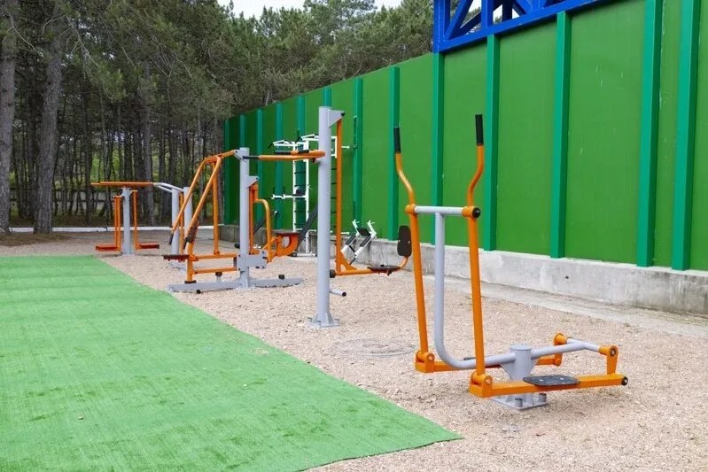 - площадка для воркаута с тренажерами (11*8, покрытие — искусственная трава, на площадке: турники, брусья, шведская стенка, современные тренажёры (шаговый, маятник, верхняя тяга, жим ногами, эллипсоид);